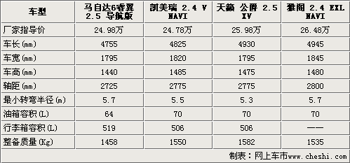 我們選取的四款車型都是位于該車系中的頂配車型,售價都在25萬元左右,馬自達6睿翼在這四款車型中屬于售價比較低的。在車身尺寸方面馬自達6睿翼是4款車型中最小的,同時在軸距方面也只有2725mm,這意味馬自達6睿翼在這四款車型中的內部尺寸應該是最小的。雅閣的軸距是四款車型最大的,達到了2800mm,保證了雅閣內部空間的寬敞。凱美瑞和天籟•公爵都同時擁有2775mm的軸距,它們在內部空間上將不會有太大的差距。四款車型中除了馬自達6睿翼外其余三款車型均達到了70升。由于馬自達6睿翼身材較小,所以在整車質量方面它也是4款車型中最輕的。
