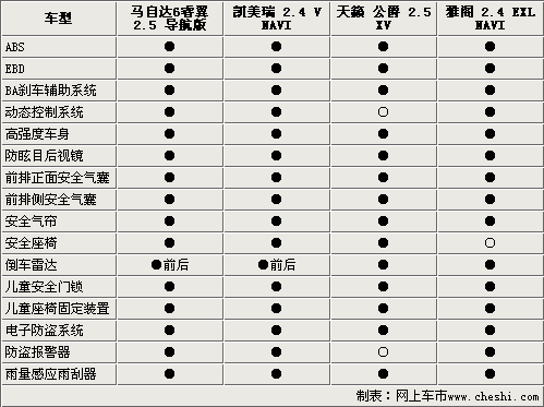 隨著汽車市場的日益成熟,安全能力逐漸也成為了車主最為關心的問題。可以看出ABS+EBD和6安全氣囊均成為了這四款車型的標準配置。四款車型里天籟•公爵沒有配備車輛行駛動態控制系統是一個不小的遺憾。在大多數車型都裝配了氣囊的情況下,馬自達6睿翼、凱美瑞和天籟•公爵還提供了安全座椅去保護前排乘員的頭頸部安全,這一點非常值得稱贊。另外這四款車型均裝備了自動防眩內后視鏡,更加保障了夜間行車的安全。