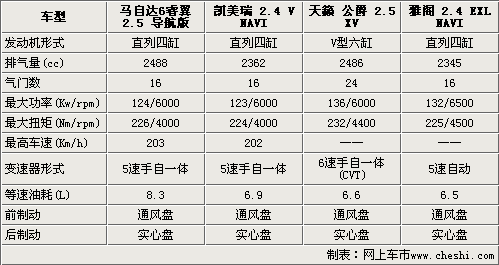 通過上述描述,相信您對這四款車型有了一個大致的了解。馬自達6睿翼外觀設計較為時尚,安全性能突出,具有較高的性價比。新雅閣擁有大氣的外觀,全面的配置絕對能夠滿足大多數公務用途。凱美瑞在市場上有著絕對的號召力和保有量,消費者對它的反應更是有口皆碑的,是一款不折不扣的全能車型。而天籟•公爵則擁有出色的動力性能。四款車可以說是各有各的特點和優勢,至于最終的選擇還要看消費者的實際需求了。 (李曉磊)