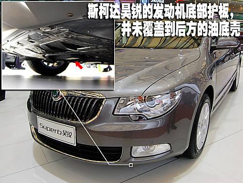 斯柯達昊銳的發動機下方護板面積同樣比較小,發動機油底殼位置下方沒有被護板覆蓋。但是其下護板的斜坡起設計也能夠對發動機油底殼起到一定的保護作用。