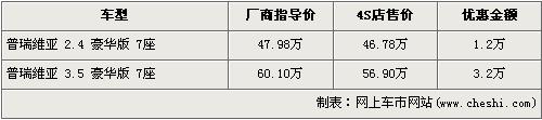 據(jù)4店銷售人員介紹,目前銷售的普瑞維亞車型只有2.4豪華版7座和3.5豪華版7座兩款車型。經(jīng)1.2萬元優(yōu)惠后,2.4L豪華7座版售價從47.98萬元降到了46.78萬元,而3.5L豪華7座版經(jīng)全系最高的3.2萬元優(yōu)惠后,售價由60.10萬元降到了56.90萬元。銷售人員還介紹,兩款車型現(xiàn)車齊全,消費者挑選的空間較大。