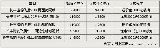 飛騰采用三菱最新研制的超級四輪驅(qū)動(dòng)系統(tǒng),使飛騰全身充滿活力。具有強(qiáng)勁的動(dòng)力性能和較好的平穩(wěn)性能。并且,具有低燃耗等優(yōu)點(diǎn)。近日根據(jù)網(wǎng)上車市價(jià)格監(jiān)測系統(tǒng)顯示,目前上海地區(qū)購買長豐獵豹累計(jì)最高優(yōu)惠6000元。具體車型售價(jià)見下表: