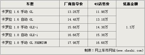 卡羅拉是一汽豐田07年推出的主力經濟型轎車,此車全系共有5款車型,排量分為1.6L、1.8L,價格區間為13.28萬元-17.98萬元。近日根據網上車市價格監測系統顯示,卡羅拉全系優惠1.3萬元,最低售價不足12萬元,具體詳情請看下表: