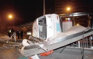 司機(jī)酒后駕車 撞毀路側(cè)公交站亭后側(cè)翻