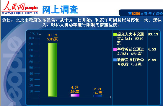 截至10月6日,共有6000余網(wǎng)友參加了我們的網(wǎng)上投票。其中,93.1%的網(wǎng)友認(rèn)為私車限行應(yīng)提交人大審議通過后執(zhí)行;4.5%人認(rèn)為這項決策應(yīng)舉行聽證會通過后執(zhí)行;僅有2.4%的網(wǎng)友認(rèn)為限行可以由政府發(fā)布行政命令執(zhí)行。