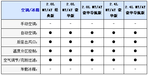 內飾方面2.0L均配備織物座椅,而2.4L車型則采用真皮坐椅并且配備電加熱座椅,并且2.0L配備6向手動調節駕駛座椅,而2.4L配備8向電動調節并且代腰部支撐的駕駛座椅,不過副駕駛全車系只標配4向手動調節座椅,另外入門級車型只配備CD播放器,2.0L和2.4L豪華型采用6CD播放器,而2.0L和2.4L豪華導航型配備DVD播放器和6.5寸寬屏液晶顯示器;包括導航功能,全系標配6喇叭揚聲器、多功能方向盤自動分區空調和后排足部出風口。