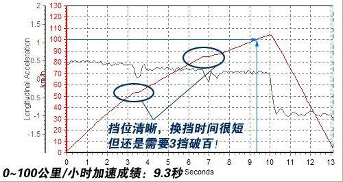 成績雖然出來了,但測試過程我們還是要關注一下。由于是6擋密齒比設定,酷寶需要換上3擋速度才能破百,剛才我們已經說了,換擋行程和擋把過長都會影響成績,從圖中可以看出,我們的擔心確實映現了。換擋影響了時間,但總體來看9.3s的成績比較令人滿意。