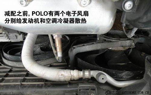 減配之前的POLO車前有一大一小兩個風扇,一個是專門給發(fā)動機水箱降溫的大風扇,一個是專門給空調(diào)冷凝器降溫的小風扇。減配之后,只剩下一個大風扇,能夠同時給兩處提供散熱。
