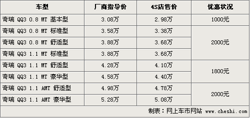據4S店銷售人員介紹,目前QQ3的優惠幅度在1000元-2000元之間,優惠形式各4S店有一定的差別,主要以現金優惠和贈送裝飾為主。目前最QQ3最便宜車型價格已經不足3萬元,最為一款都市時尚代步工具而言,這樣的價格非常的實惠。現車方面,QQ3有多種顏色可選,消費者可到店看車選購。