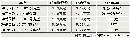 據比亞迪汽車4S店銷售人員介紹,現在比亞迪F0愛國版igo系列車型的現車比較齊全,只有旗艦型沒有現車,但消費者可以預訂。售價3.99萬元的老款舒適型現在已經停產,而老款豪華型目前還有部分現車銷售。另外,比亞迪FO老款豪華型和尊貴型目前都可以優惠現金1500元,實用型和新舒適型只可以贈送部分裝飾。