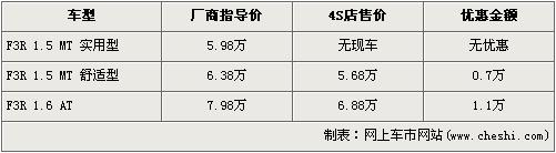 據比亞迪汽車北京地區4S店銷售人員介紹,比亞迪F3R全系均有優惠,最高配的1.6L自動檔車型的優惠金額為1.1萬元,達到了全系最高,1.5手動舒適版優惠金額為7000元。經過優惠后,1.5L手動舒適型的售價降為5.68萬元,頂配的1.6L自動檔售價降為了6.88萬元。銷售人員還介紹,1.5L手動實用版已無現車,所以不在此次優惠范圍內。