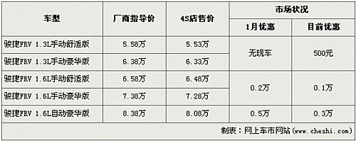據經銷商處銷售人員介紹,目前駿捷FRV在售的有五款車型,優惠金額都分別有所下降。1.3L車型優惠500元,1.6L手動檔車型優惠從2000元降到了1000元,1.6L自動檔車型優惠也從5000元降到了3000元。經過優惠調整后,1.6L手動舒適型售價變為6.48萬元,1.6L手動豪華版售價變為7.28萬元。全系最高配的1.6L自動豪華型售價回升到了8萬元區間。