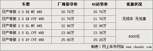 奇駿自去年11月上市以來一直備受消費者關注。國產后的奇駿填補了東風日產在SUV領域的空白,為那些對越野性有更多需求的城市SUV消費者提供了更多的選擇機會。根據網上車市價格監測系統顯示,奇駿現車供應仍然比較緊張,只有2.5兩款車型有現車供應,其他三款車需要消費者預訂。目前消費者購買2.5排量車型,最高可享受到6000元的現金優惠!