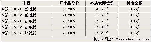 東風(fēng)日產(chǎn)奇駿自去年11月上市以來一直備受消費者關(guān)注。國產(chǎn)后的奇駿填補了東風(fēng)日產(chǎn)在SUV領(lǐng)域的空白,為那些對越野性有更多需求的城市SUV消費者提供了更多的選擇機會。根據(jù)網(wǎng)上車市價格監(jiān)測系統(tǒng)顯示,奇駿現(xiàn)車供應(yīng)仍然比較緊張,但較前一陣有所緩解,全系車型均出現(xiàn)了價格浮動。2.5頂配和豪華自動檔車型的優(yōu)惠幅度均已達(dá)到了6000元。