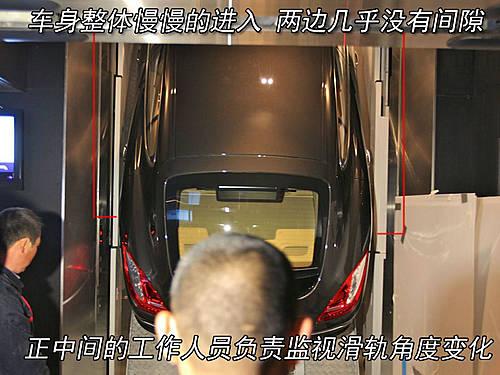 再快將車身完全吊起之前,一直都由一名工作人員監視著滑軌和運輸架的動作,并監控著車身與電梯兩側的距離。看著車身慢慢的完全進入電梯內,想必工作人員的心都在逐漸放松吧。