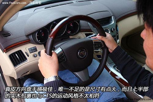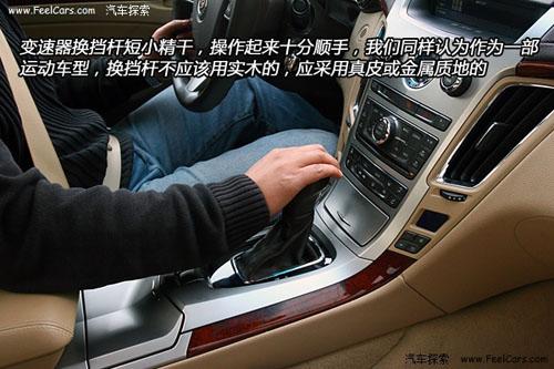 接著轉向車內看看,真皮方向盤手感極佳,唯一不足的是尺寸有點大,而且上半部的實木包裹也與CTS的運動風格不太相符。變速器換擋桿短小精干,操作起來十分順手,不過我們同樣認為作為一部運動車型,換擋桿不應該用實木的,而應該用皮質或金屬的。