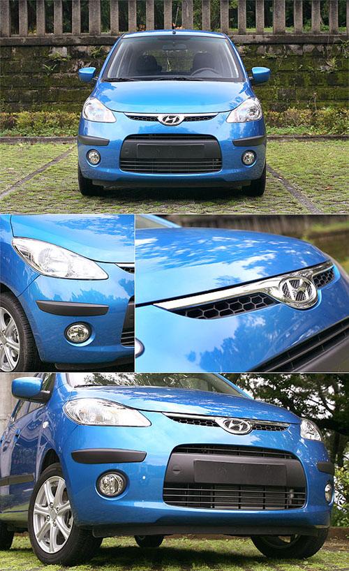 從車頭開始,i10便以銳利的頭燈造型,搭配精致的圓形霧燈,展現了年輕活潑的視覺效果,而在水箱護罩部分的設計,i10則與Lavita有著異曲同工的手法,但在上緣及橢圓形廠徽四周增添了鍍鉻妝點,視覺效果更為突出,下方氣壩雖然為如同Lavita呈現類似微笑般嘴型的設計,但仍不減i10的可愛指數。