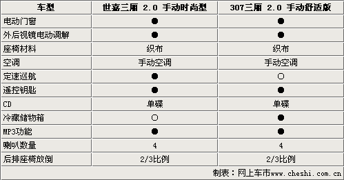 由于兩款車型都是2.0的低配車型,所以在配置方面沒有太突出的地方。電動門窗、外后鏡電動調節、遙控鑰匙和后排座椅放倒功能都是它們的標配。但是兩款車型還是各自都有各自的特點,雪鐵龍世嘉三廂配備了定速巡航,可以大大減少駕駛員長途駕駛的疲勞。標致307則配備了具有冷藏儲物功能的手套箱。這些配置在同級別同價位的車型中都是很少見到的。