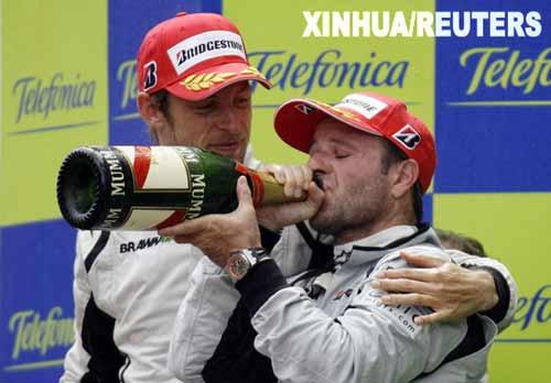 5月10日,布朗GP車隊的英國車手巴頓(左)和隊友巴里切羅慶祝勝利。當日,在F1西班牙大獎賽中,巴頓奪得冠軍,巴里切羅獲得亞軍。新華社/路透