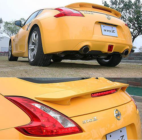 為了強(qiáng)化運(yùn)動(dòng)氣息,標(biāo)準(zhǔn)版的370Z標(biāo)配后擾流尾翼;雖然造型不顯夸張,仍頗具畫龍點(diǎn)睛之效;而后保桿的造型也小有來(lái)頭:左右大口徑雙出尾管已是性能車不可或缺的身份表彰,設(shè)計(jì)師更在中央位置加入一組方型后霧燈。除了后霧燈的作用外,此一燈具在踩踏剎車時(shí)也會(huì)同步有反應(yīng),頗有模仿F1賽車雨天警示燈組的意味。