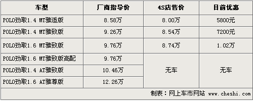 據銷售人員介紹,目前POLO勁情全系優惠幅度從3900元-6000元不等,優惠后售價從8.19萬-10.56萬元。同時,近期推出的POLO運動款也受到消費者喜愛,據銷售介紹,現車到店即買。運動款主要有藍色、黑色以及白色。目前POLO勁情以及運動版均已沒有現車供應,需預定,訂金為1萬,一個月時間才能提車。