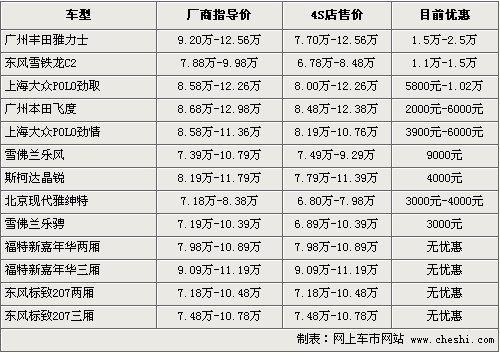 隨著石油價格逐步上漲,小排量車逐漸受到消費者親睞。為了爭得市場,各汽車品牌推出的1.6L以內AO級車型數量和款式越來越多,競爭也隨之加劇。以下我們總結的13款AO級車型價格均在7萬-13萬之間,排量覆蓋了1.2、1.3、1.4、1.5和1.6五個區間,可供選擇的空間非常大,而價格優惠從2000元-2.5萬元不等,在消費者購車時既可以享受小排量購置稅的優惠政策,也可以得到4S店的降價優惠,既省車錢,又能少花油錢。具體車型以及價格優惠參考如下: