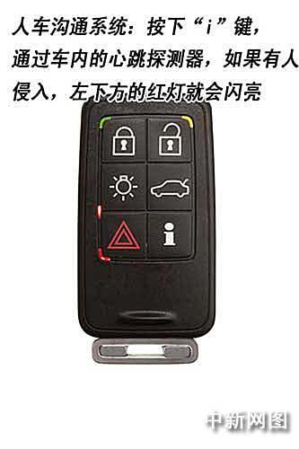 人車溝通系統(PCC)是沃爾沃汽車公司所獨的,將PCC隨身攜帶,在您到達車邊時汽車將自動開鎖。按下儀表盤上的按鈕即可啟動發動機。按下信息按鈕,就可以知道車門鎖閉狀態以及車內的各個系統是否正常關閉。一個很特殊的設置是,根據沃爾沃工作人員的演示,按下“i”鍵,就可以通過安裝在車內的心跳探測器知道車內是否有人,防止乘客被誤鎖或車輛被非法侵入的情況。(陳鑫)