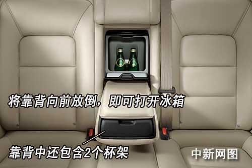 在后座中間座位靠背后方有一個冰箱。將靠背向前放倒,即可打開冰箱,同時,靠背中還有2個杯架,方便乘客在旅途中放杯子。
