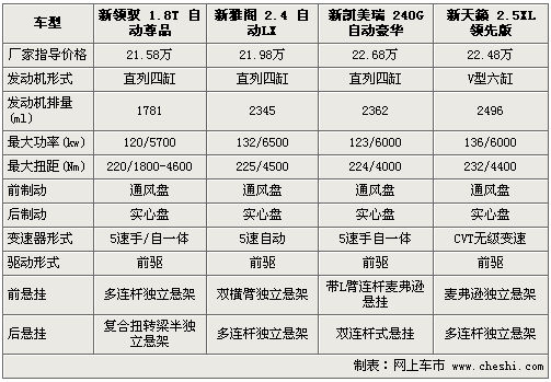 新領馭全系7款車型已于上月底正式上市,售價為16.98-30.38萬元。除前臉和尾部的全新設計外,老款1.8T引擎經過重新調教最大功率達120Kw。而在此中級車細分市場中,新雅閣、新凱美瑞和新天籟均占據著一定的市場份額。下面通過對四款價格相近車型進行詳實解析,以便為您的購車提供一定的參考。