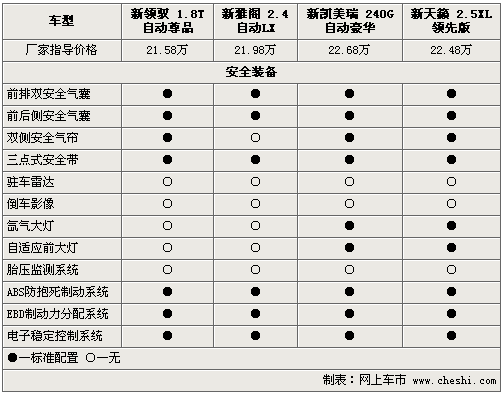 新領(lǐng)馭、新雅閣、新凱美瑞和新天籟作為中級車標(biāo)桿,其在安全性能方面可謂是下足了功夫。前排安全氣囊、側(cè)安全氣囊及電子穩(wěn)定程序等均成為四款車的標(biāo)準(zhǔn)配置。而新凱美瑞和新天籟配備了自適應(yīng)氙氣大燈,較其它兩款車提升了夜間行駛安全性。除此之外,新雅閣是四款同級車型中唯一沒有配備側(cè)氣簾的車型,讓人略感遺憾。