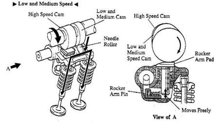 在可變氣門正時方面HONDA發(fā)動機具有一定得領(lǐng)先性他的發(fā)動機在低負荷運轉(zhuǎn)情況下,小活塞在原位置上,三根搖臂分離,主凸輪和次凸輪分別推動主搖臂和次搖臂,控制兩個進氣門的開閉,氣門升量較少,其情形好像普通的發(fā)動機。雖然中間凸輪也推動中間搖臂,但由于搖臂之間已分離,其它兩根搖臂不受它的控制,所以不會影響氣門的開閉狀態(tài)。但當發(fā)動機達到某一個設(shè)定的高轉(zhuǎn)速(例如3500轉(zhuǎn)/分時,本田S2000型跑車要達到5500轉(zhuǎn)/分),電腦即會指令電磁閥啟動液壓系統(tǒng),推動搖臂內(nèi)的小活塞,使三根搖臂鎖成一體,一起由中間凸輪驅(qū)動,由于中間凸輪比其它凸輪都高,升程大,所以進氣門開啟時間延長,升程也增大了。當發(fā)動機轉(zhuǎn)速降低到某一個設(shè)定的低轉(zhuǎn)速時,搖臂內(nèi)的液壓也隨之降低,活塞在回位彈簧作用下退回原位,三根搖臂分開。這樣一來就保證了您在低轉(zhuǎn)速時對油耗的控制,同時滿足你在發(fā)動機處于高轉(zhuǎn)速下澎湃動力輸出的需要。整個VTEC系統(tǒng)由發(fā)動機主電腦(ECU)控制,ECU接收發(fā)動機傳感器(包括轉(zhuǎn)速、進氣壓力、車速、水溫等)的參數(shù)并進行處理,輸出相應(yīng)的控制信號,通過電磁閥調(diào)節(jié)搖臂活塞液壓系統(tǒng),從而使發(fā)動機在不同的轉(zhuǎn)速下由不同的凸輪控制,影響進氣門的開度和時間。從而產(chǎn)生出您最希望獲取的動力輸出。