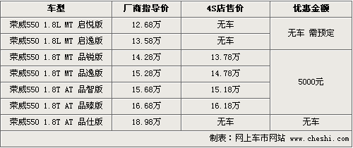 據(jù)4S店銷售人員介紹,目前榮威550銷售的車型主要以1.8T車型為主,其中性價比較高的車型為1.8T品臻型,4S店內(nèi)現(xiàn)在有現(xiàn)車供應(yīng),現(xiàn)金優(yōu)惠5000元左右,到店還可有一定幅度讓利。而1.8L啟悅版、啟逸版和1.8T品仕版則需要預定,訂金為2000元,需要等一個星期左右。