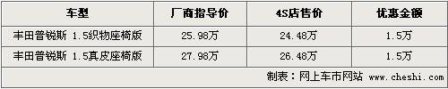 據4S店銷售人員介紹,目前普銳斯全系有兩款車在售,售價分別為25.98萬和27.98萬元,現在購車的話可以優惠現金1.5萬元。款式和顏色不太齊全,訂車的話周期比較長,需等大概2個月時間。