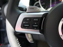 三輻真皮方向盤融合了7個多功能控制按鈕,方便Driver對不同功能進行調節。當然,撥片換擋這一運動車的標志性配置同樣出現在方向盤后面,左右兩側各一組,兩手同為“按減撥增”的設計方便適應不同的駕駛習慣。