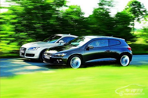 當“尚酷”吹來時,情況變了。這是一位血緣相同的異姓兄弟,同樣來自PQ35平臺,同樣是轎跑車,一身平民裝束讓它看起來就像是一位起義領袖。雖然它登臺的目的不是要窩里反,可是這無疑給了我們這些成天琢磨汽車的好事者一個制造“爭端”的機會。于是TT 1.8TFSI和尚酷1.4TSI就被強迫上了擂臺。
