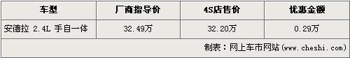 據4s店銷售人員介紹,目前歐寶安德拉現金優(yōu)惠2900元,在售的2.4L 手自一體車型售價經優(yōu)惠后降為了32.20萬元。本車外觀共有白、乳白、黑、灰、銀、藍6種顏色,內飾有黑、棕兩種顏色,總共12種顏色搭配供消費者選擇。銷售人員還介紹,店內現車比較有限,以灰色和藍色為主,其他顏色需預訂。