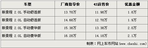 根據(jù)經(jīng)銷(xiāo)商處銷(xiāo)售人員介紹,“大嘴”新景程2.0L手動(dòng)舒適版現(xiàn)金優(yōu)惠1.8萬(wàn)元,經(jīng)優(yōu)惠后售價(jià)下降到了11.98萬(wàn)元,已不足12萬(wàn)。最高配的2.0L自動(dòng)豪華版車(chē)型經(jīng)全系的最高2.1萬(wàn)元優(yōu)惠后,售價(jià)降到了14.18萬(wàn)元。銷(xiāo)售人員還表示,目前店內(nèi)現(xiàn)車(chē)充足,顏色也全,消費(fèi)者自由挑選的空間變得更加便利,更加自由。