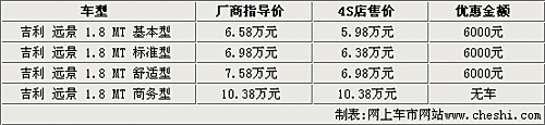據(jù)吉利汽車4S店銷售人員介紹,吉利遠(yuǎn)景目前商務(wù)型仍然沒有現(xiàn)車,其他車型的貨源比較充足,而且有6000元的優(yōu)惠。另外,消費(fèi)者到店購(gòu)車還可以贈(zèng)送裝飾。啟用吉利全新車標(biāo)的EC718將很快上市,在車型配置以及車型級(jí)別將高于現(xiàn)款遠(yuǎn)景,預(yù)計(jì)價(jià)格也將高于現(xiàn)款遠(yuǎn)景。