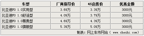 據銷售人員介紹,現在比亞迪F0愛國版igo系列車型的現車比較齊全,只有旗艦型沒有現車,但消費者可以預訂。售價3.99萬元的老款舒適型現在已經停產,而老款豪華型目前還有部分現車銷售。另外,比亞迪F0老款豪華型和尊貴型等全系目前都可以優惠現金3000元。