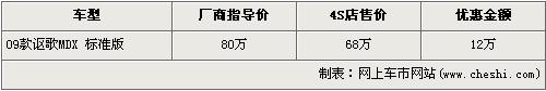 據經銷商銷售人員介紹,09款謳歌-MDX的現金優惠12萬元,優惠后售價也從原廠商售價80萬降到了68萬,首次跌破了70萬元。銷售人員還介紹,09款謳歌MDX增加的實用性的配件包括前下護板和后下護板,能避免惡劣路況對底盤帶來的損傷,并且09款謳歌MDX還新增了巴厘海藍和摩卡褐金兩種顏色,店內現車非常充足,顏色也比較全,欲購買者挑選的空間非常大。