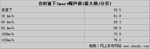 也許有人會擔心smart這么小的車隔音和密封性是否有問題,為此我們在北京北四環(huán)路中關(guān)村附近進行了測試,在車外我們測得了最高77分貝的環(huán)境噪聲;而當我們進入到車內(nèi)噪聲指數(shù)立即下降了22分貝之多,55分貝的水平幾乎達到了辦公室的安靜程度。