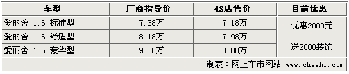 據4S店銷售人員介紹:目前新愛麗舍最高優惠達2000元,店內另送2000元裝飾。目前新愛麗舍現車非常充足,顏色齊全,白色、銀色等暢銷的顏色可供挑選。