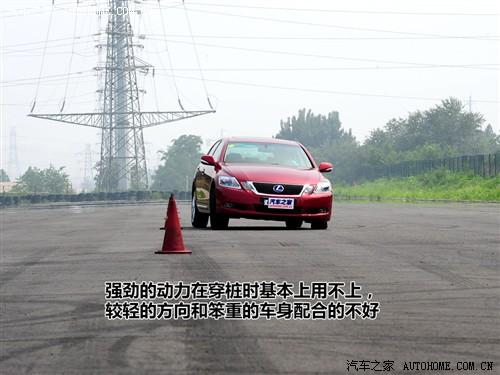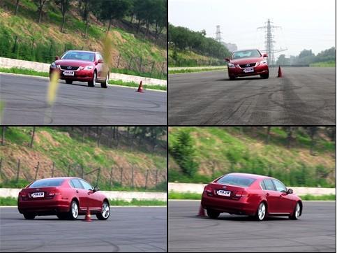 經過了城市道路和高速公路上對這款GS450h的體驗,感覺穿樁測試對于這款車來說應該不算是什么難事。可真到了測試場地上,GS450h的表現并不像我們想象的那樣。這款車的懸掛雖然是可調的,但即便是運動模式,還是有對于舒適性能的考量,懸掛還是有點軟。所以在穿樁這種比較強調運動性能的環節,車身的側傾還是顯露出了一些。雖然說因為把一塊大電池放在了后座的后面,使得GS450h的前后重量比達到了50:50,但實際上這款車的操控性并不像那些真正注重運動性能的車型的操控性那么優秀,方向盤的指向在樁間表現比較輕,動力的跟進也還算可以,但后輪在樁間明顯感覺有點笨重,而且車內的防滑控制接觸開關時無法將防滑系統徹底關閉的,所以在穿樁的過程中防滑控制總是會干預,所以想要開著GS450h在穿樁場地上跑出個很好的成績真不是一件容易的事情,或者說它就不是干這事兒用的。
