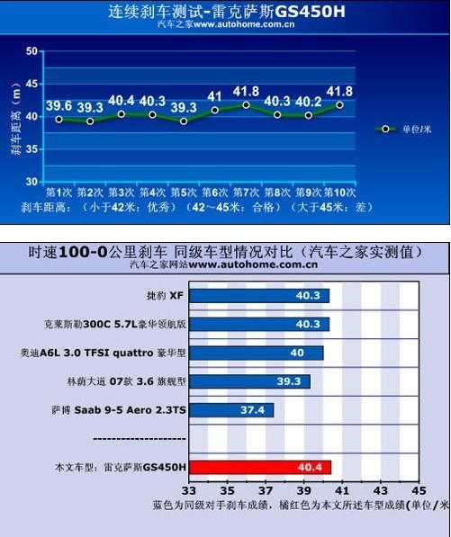 從連續十次的剎車成績表中,不難發現GS450h的連續剎車能力并不說是很強的,連續的十組剎車成績雖然都能保持在優秀剎車成績線42米之內,但從中我們也可以發現一個問題,十組剎車成績在圖表中呈現出微微上揚的曲線,這說明GS450h的剎車系統在抑制熱衰減這個環節上還有改進的空間。
