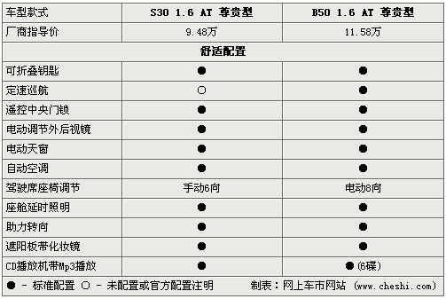 在舒適配置方面,東風S30與奔騰B50同樣不分伯仲,其中區別就是B50配有定速巡航、電動8向調節座椅以及6碟CD,其他如遙控中央門鎖、自動空調、CD播放等都為兩車的標配,能夠滿足消費者的日常需求。
