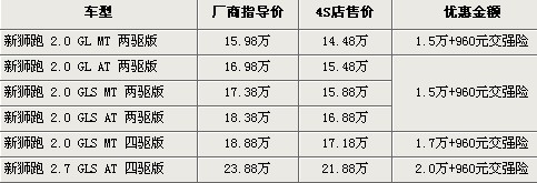 據4S店銷售人員介紹,目前購買獅跑可以贈送960元的交強險,同時有1.5萬-2萬元不等的現金優惠。兩驅標準版優惠后售價僅為14.48萬元。目前經銷商處有黑色、銀色等現車供應,藍色等款需要預定,訂金為2千元,月內便可以順利提車。
