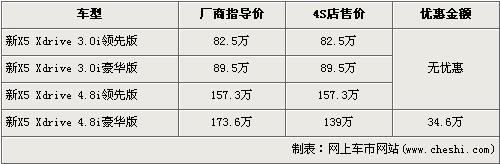 據經銷商處銷售人員介紹,近期購買X5的消費者可以得到最高34.6萬元的優惠。新款的寶馬X5 3.0i領先版車型、3.0i豪華版和4.8i領先版店內均無現車,4.8i豪華版經34.6萬元優惠后,售價從173.6萬元下降到了139萬元。