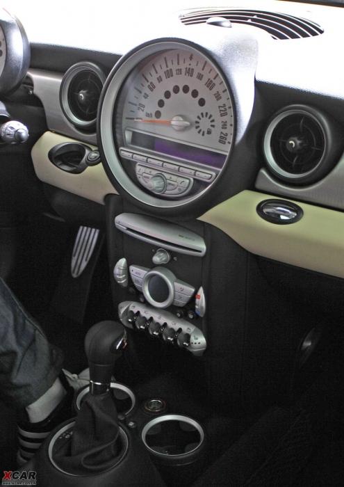 坐進MINI的車內,一個圓形的白色大儀表盤非常惹眼,可電子顯示車速、油量、冷卻劑以及其他功能狀態等信息。這種布局自從1968年以來一直是MINI典型特征。控制臺下方帶有6個條形小開關是從原創MINI繼承而來的,這些開關均為彈簧式按鈕,使用后自動彈回原來狀態。