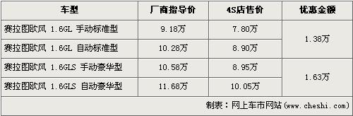 據(jù)經(jīng)銷商處銷售人員介紹,賽拉圖歐風(fēng)全系最高出現(xiàn)了最高1.63萬元的優(yōu)惠。賽拉圖歐風(fēng)在售的有4個(gè)車型,入門級的1.6L手動標(biāo)準(zhǔn)版的優(yōu)惠金額為1.38萬元,售價(jià)從廠商指導(dǎo)價(jià)9.18萬元降到7.80萬元,1.6L豪華版的手動版和自動版車型都經(jīng)全系最高1.63萬元優(yōu)惠后,售價(jià)分別降至8.95萬元和10.05萬元。