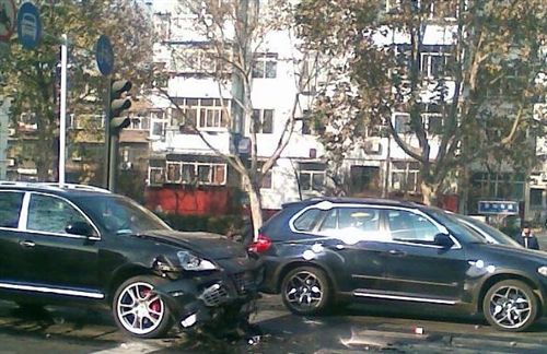 事情的經(jīng)過一定很復(fù)雜,不過車禍的現(xiàn)場很簡單,我們可以看到兩輛保時(shí)捷卡宴前臉損毀,而BMW X5好像沒什么事,可以直接開回家。